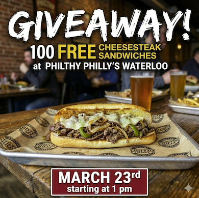Mark your calendars, Waterloo! We’re giving away FREE Philly Cheesesteaks to the first 100 people for one day only. You don’t want to miss this legendary local feast.