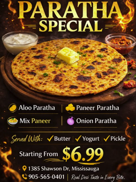 Craving real desi taste? Come enjoy our freshly made Aloo, Paneer, Mix Paneer & Onion Parathas served hot with butter, yogurt & pickle 🤤