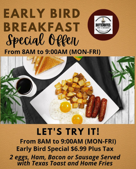 🌅 **Early Bird Breakfast Special at Butterbites!** 🌅