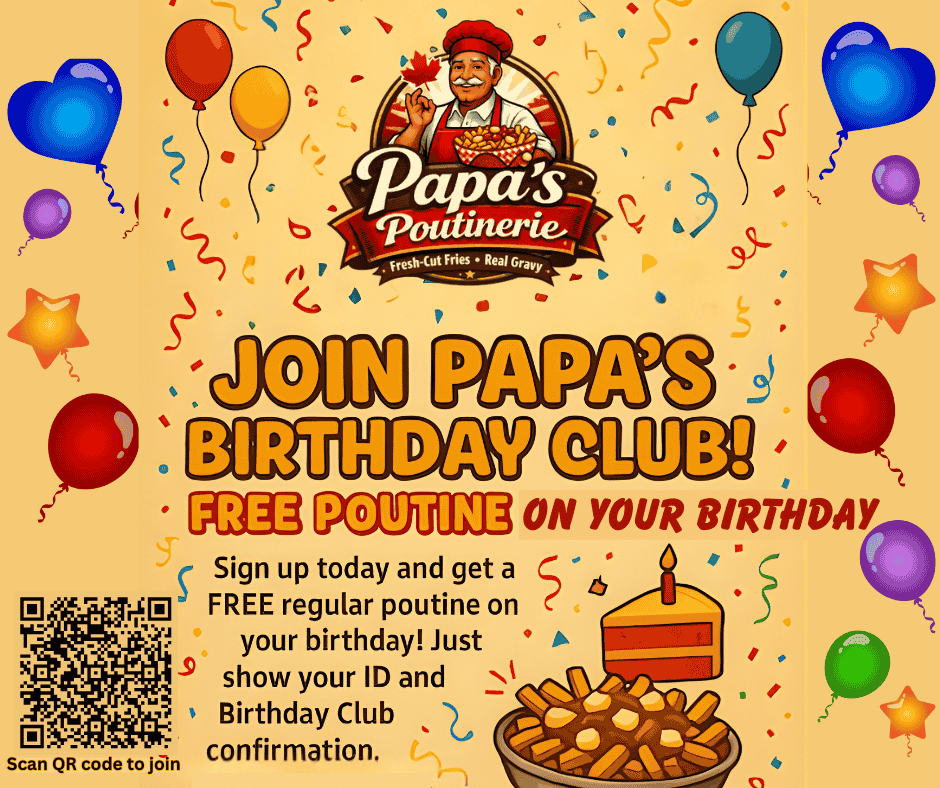 Sign up now for Papa's Birthday Club – enjoy a FREE poutine on your birthday!