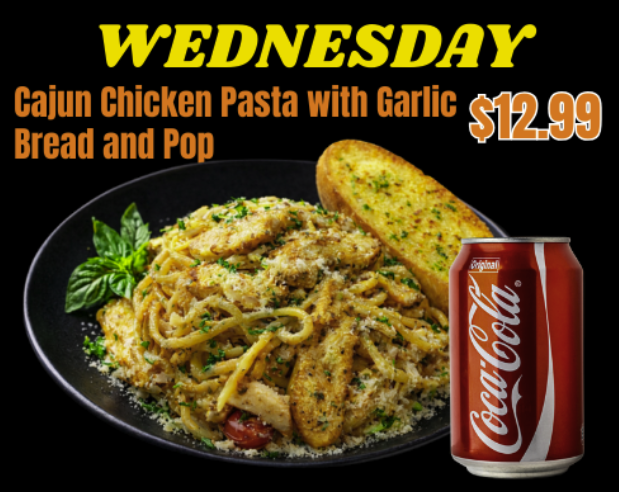 Wednesday Special - Cajun Chicken Pasta with Garlic Bread & Pop - $12.99