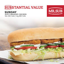 Every Sunday - Enjoy SUBStantial Value! Enjoy a small Spicy Breaded Chicken sub every Sunday for only $6.99 + applicable taxes! Make it a Large for ONLY $9.99 Mr. Sub Sub of the Day