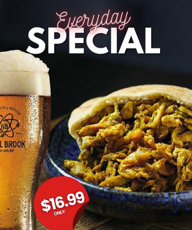 Our famous Pita Chicken Shawarma with special spices accompanied with a 16oz Pint Beer. It comes with your choice of two sauces.