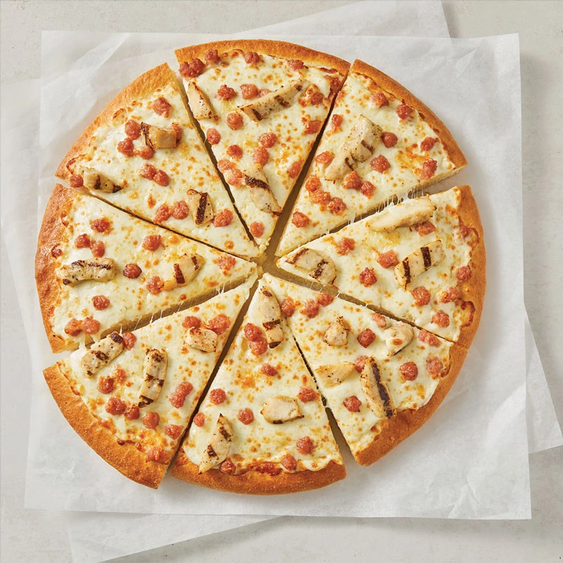 Chicken Caesar - $10.99 for a Medium Pizza Of The Day Chicken Caesar - Alfredo sauce, seasoned grilled chicken breast, bacon crumble, roasted garlic, parmesan and pizza mozzarella