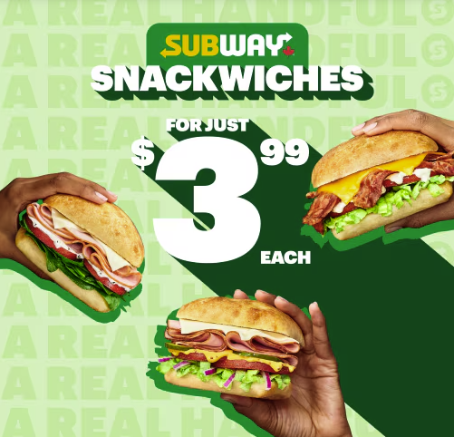 Try a Subway® Snackwich with toasted ciabatta, freshly sliced deli and crisp veggies for just $3.99 each."